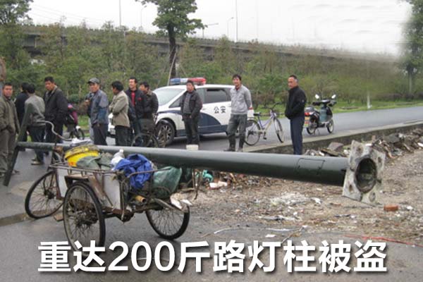 次年2010年3月,杭州濱江路上一男子用自己腳踏三輪車承載著正準(zhǔn)備安裝的6米路燈燈柱,該燈柱重達(dá)200斤。幸好被周邊民眾圍堵后攔下來,隨后民警趕到現(xiàn)場。