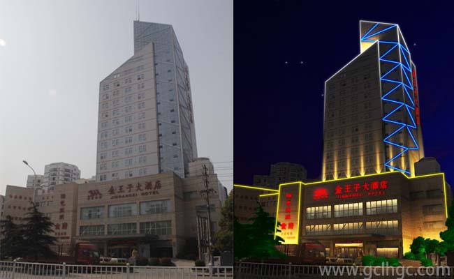 金王子大酒店作為當地的一座地標性建筑,酒店方對亮化這一塊非常重視,亮化方案不能太過于浮夸、手法不能太重、耗電不能過大等等,施工方肖總也是方案改了一次又一次,關于耗電這個問題也就意味著布燈的數量不能多,盡量少。但是燈具少了布燈的方案要配合好,不然會影響整體效果。