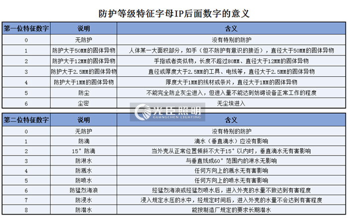 光臣智科同樣沿用國(guó)際上采用的字母“IP”(International protection)后面跟兩個(gè)數(shù)字來(lái)表示燈具的防塵、防水等級(jí)。前一位數(shù)字表示對(duì)人、固體異物或塵埃的防護(hù)能力,后一位數(shù)字表示對(duì)水的防護(hù)能力,見下圖: