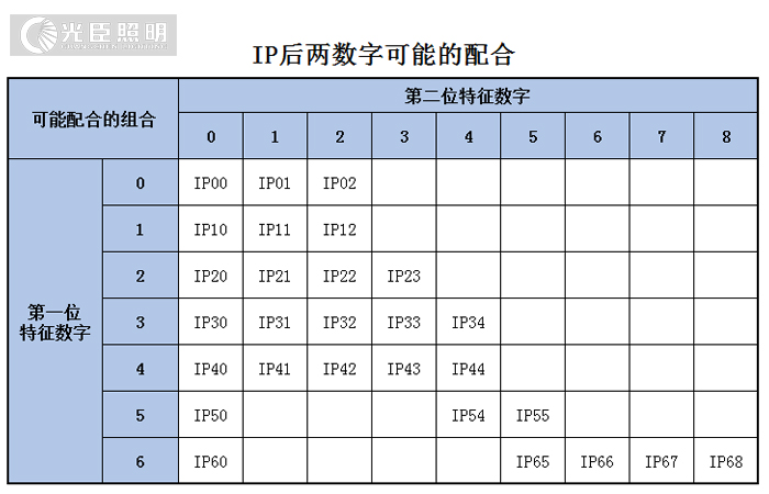 顯然,LED亮化燈具在防塵能力和防水能力之間存在一定的依賴關(guān)系,也就是說(shuō)前一位數(shù)字和后一位數(shù)字之間有一定的依存關(guān)系,大家看小編為大家整理的下面這張結(jié)合配圖: