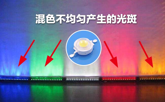 市面上大部份七彩大功率洗墻燈所選用的光源是單顆紅、綠、藍(lán)燈珠組合而成,常規(guī)功率為單顆1W左右,如果按1W的大功率燈珠計(jì)算,那么功率越低燈珠數(shù)量越少、燈珠與燈珠之間的間距就越大,所造成的光斑就越嚴(yán)重。
