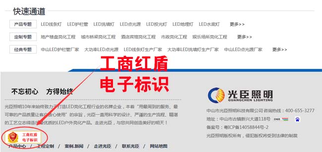 大看可以通過(guò)這個(gè)標(biāo)識(shí)去了解該公司的資質(zhì),紅盾電子標(biāo)識(shí)一般會(huì)安裝在網(wǎng)站的底部位置,這也是您找線(xiàn)條燈廠(chǎng)家的一種標(biāo)準(zhǔn)之一哦,光臣照明從網(wǎng)站建站開(kāi)始已取得紅盾電子標(biāo)識(shí),您可以通過(guò)官方網(wǎng)站首頁(yè)底部查看。